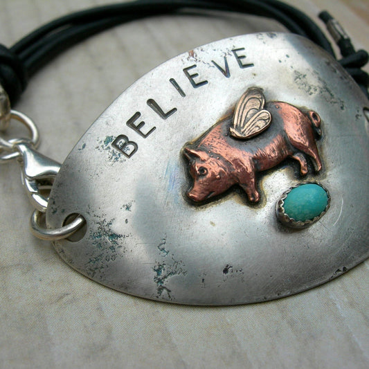 Believe Pigs Fly Bracelet from RECYCLED SPOON in Solid Silver & Turquoise by iNk Jewelry